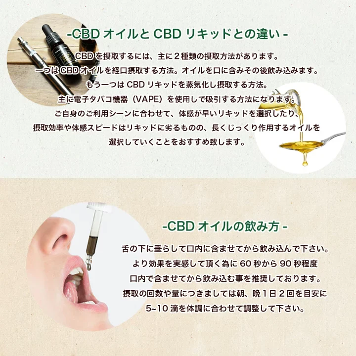 CBDを摂取するには、主に2種類の摂取方法があります。一つはCBDオイルを経口摂取する方法。オイルを口に含みその後飲み込みます。もう一つはCBDリキッドを蒸気化し摂取する方法。主に電子タバコ機器(VAPE)を使用して吸引する方法になります。ご自身のご利用シーンに合わせて、体感が早いリキッドを選択したり、摂取効率や体感スピードはリキッドに劣るものの、長くじっくり作用するオイルを選択していくことをおすすめ致します。