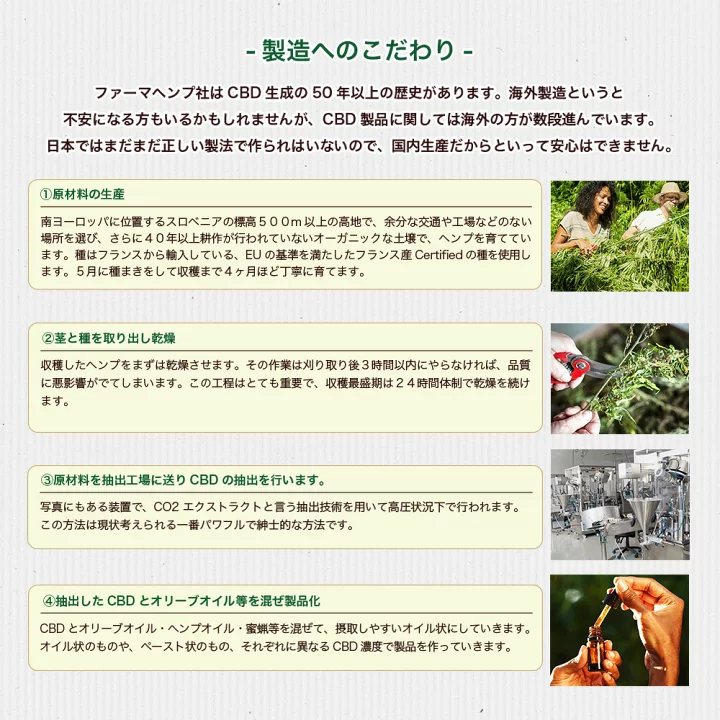 スロベニアを拠点に置くファーマヘンプは、伝統的な有機栽培で育てられた麻を使用し、より高い濃度でピュアなCBDオイルを抽出しています。契約農家から高品質の原材料を調達して天然オーガニックにこだわった製品を作り続けている為、日本を含め世界でも非常に人気の高いメーカーです。