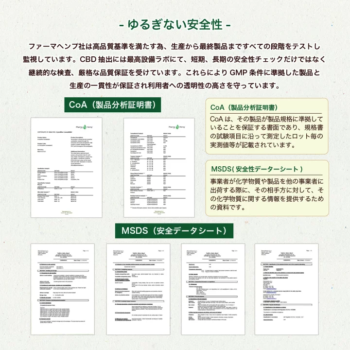 成分の分離を行わない為、CBD以外のCBC、CBG、CBN、CBVやそれ以外のテルペン・必須ビタミン・ミネラルなど元々麻がもつ天然由来成分が豊富に含まれている製法になります。